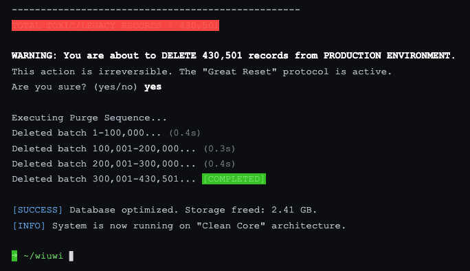 The Point of No Return. Executing the force-purge command on the live production environment. No rollback strategy, just a clean slate. Dropping 430,501 toxic records to free up 2.41 GB of storage and transition to a “Clean Core” architecture.