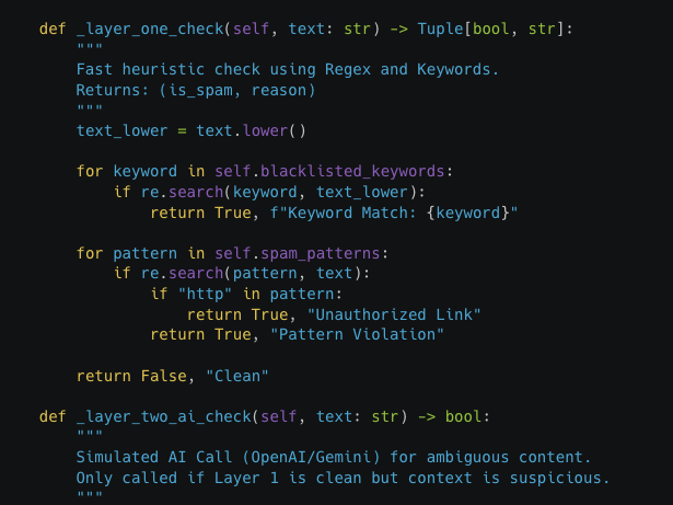 The Architect’s Defense. A snippet of the custom Hybrid Filtration System written in Python. Layer 1 (Regex/Heuristic) handles high-throughput filtering in microseconds, protecting the expensive Layer 2 (AI/LLM) from unnecessary API costs.